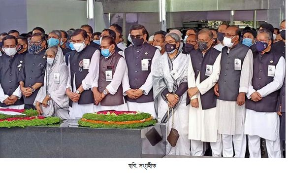রোববার সকাল ৬টা ৫০ মিনিটে ধানমন্ডির ৩২ নম্বরে স্থাপিত প্রতিকৃতিতে ওবায়দুল কাদেরের নেতৃত্বে আওয়ামী লীগের কেন্দ্রীয় কমিটির নেতারা শ্রদ্ধা নিবেদন করেন।