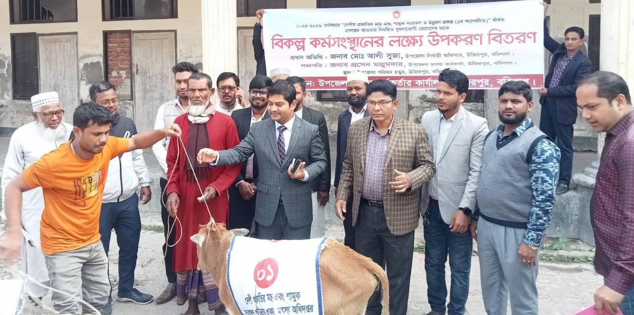 মোঃ আলীনুর ইসলাম নয়ন,উজিরপুর ঃঃ বরিশাল জেলার উজিরপুর উপজেলায় দেশীয় প্রজাতির মাছ এবং শামুক সংরক্ষণ ও উন্নয়ন প্রকল্পের আওতায় নিবন্ধিত সুফলভোগী জেলেদের মাঝে বিকল্প কর্মসংস্থানের লক্ষ্যে উপকরণ গরু বিতরণ কার্যক্রম অনুষ্ঠিত হয়েছে। ২৬ জানুয়ারি সোমবার সকাল ১১টায় উপজেলা মৎস্য অধিদপ্তরের আয়োজনে উপজেলা অডিটোরিয়াম সংলগ্ন খোলা মাঠ প্রাঙ্গণে এ কর্মসূচির আয়োজন করা হয়।