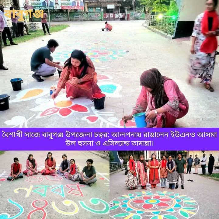 শাহজাহান খান ঃবাংলা নববর্ষ উপলক্ষে বাবুগঞ্জ উপজেলা প্রশাসনের উদ্যোগে বর্ণিল আয়োজনের মধ্য দিয়ে উদযাপিত হয়েছে পহেলা বৈশাখ। দিনব্যাপী কর্মসূচির অংশ হিসেবে উপজেলা চত্বরে অনুষ্ঠিত হয় আলপনা অঙ্কনসহ নানা সাংস্কৃতিক কার্যক্রম।